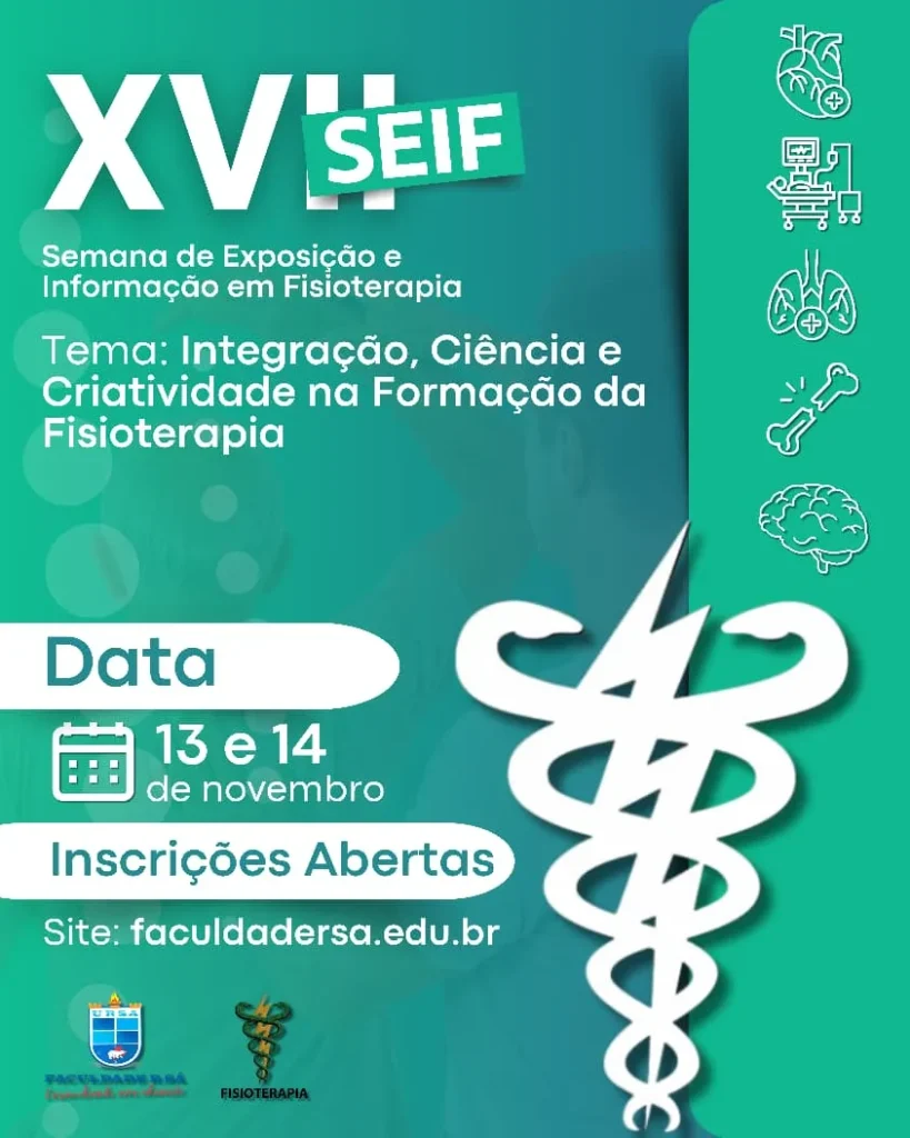 A Faculdade R.Sá, por meio do curso de Bacharelado em Fisioterapia, anuncia a abertura das inscrições para a XVII Semana de Exposição e Informação em Fisioterapia (SEIF), um dos eventos mais aguardados do calendário acadêmico da instituição. O encontro será realizado nos dias 13 e 14 de novembro de 2025, no campus da Faculdade R.Sá, em Picos (PI).