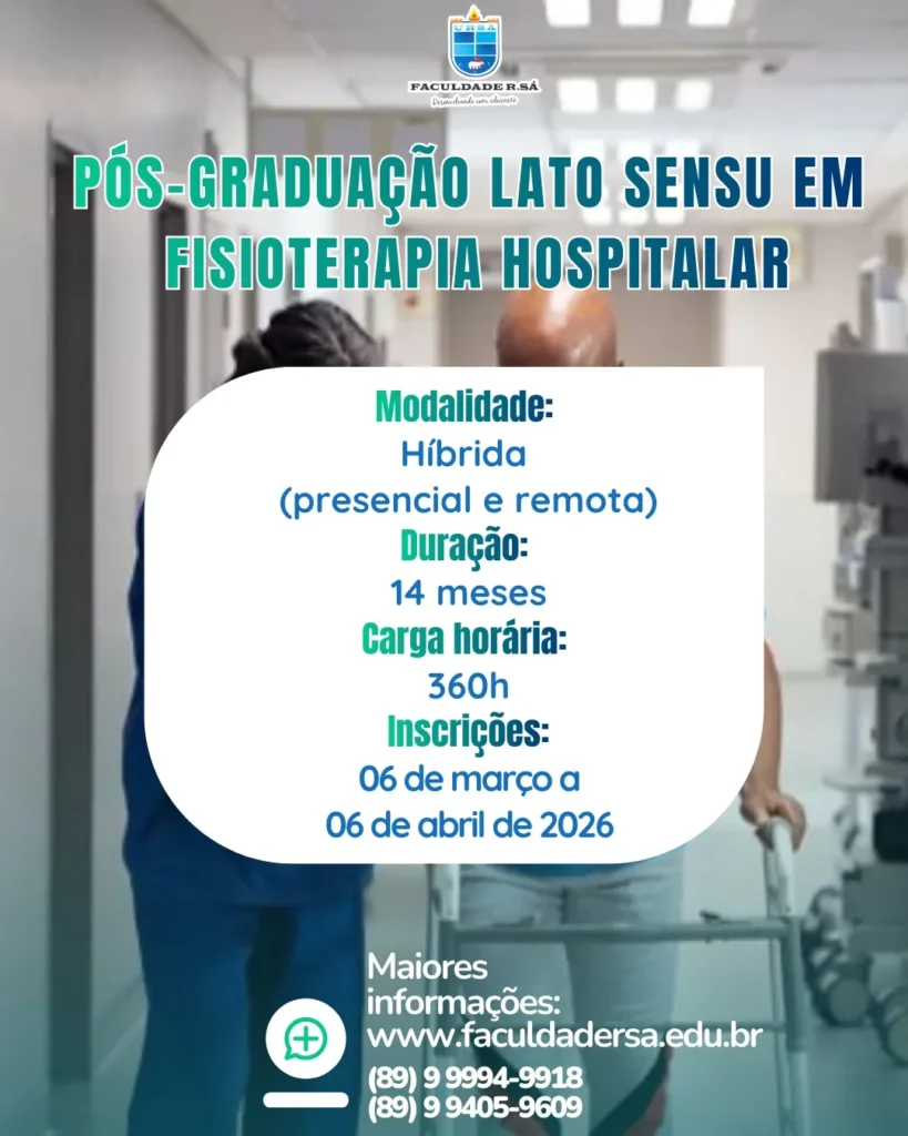 A Faculdade R.Sá inicia nesta sexta-feira, 06 de março, o período de inscrições para a Especialização Lato Sensu em Fisioterapia Hospitalar. A formação é destinada a profissionais fisioterapeutas que buscam aprofundar conhecimentos e ampliar sua qualificação para atuar de forma ainda mais preparada na assistência hospitalar.